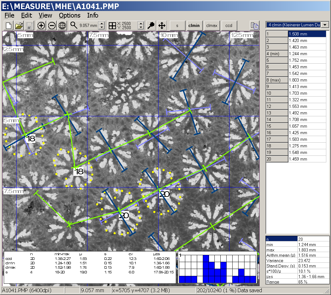 The image is loaded as an background picture and the user may mark points, polygons, and lines (and may count objects). Data are separately stored in a text file, can be reloaded and modified. Both vector data and the bitmap can be exported as WMF, JPG or BMP file, or as text. Two point lines, polygones and countings can be statistically evaluated and exported as text files.